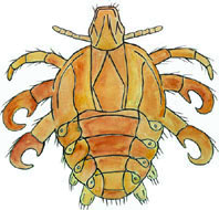 Phthirus pubis.Denominato anche piattola per la sua forma schiacciata, il pidocchio del pube è fornito di arti e uncini molto robusti capaci di ancorarsi a peli più corposi del capello. Il pidocchio del pube si trasmette per contatto intimo, soprattutto negli adulti.