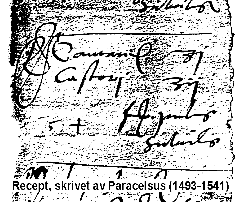 L'immagine dimostra una ricetta stilata dal medico Svizzero Philipp Aureolus Theophrast Bombast von Hohenheim (1493-1541) che si dava il nome di Paracelsus. La ricetta originale (uno di tre sullo stesso foglio) è conservato alla Biblioteca Nazionale Austriaca a Vienna.