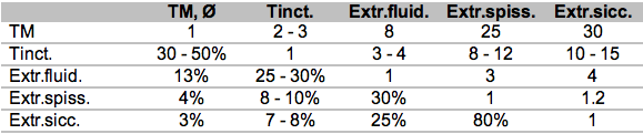 La seguente tabellina dimostra le proporzioni allopatiche (contenuto materiale di sostanze terapeuticamente attive) delle diverse preparazioni tra le TM e le Extr.sicc. E? dedicato agli ?allopatici? perché spesso ci serviamo delle TM per i nostri scopi, quando le nostre preparazioni non sono reperibili sul mercato, le omeopatiche invece sì e di ottima qualità e affidabilità. Mai un omeopata invece si servirebbe dei nostri preparati; per lui non sono ?koscher? (?regola d?arte? omeopatica).