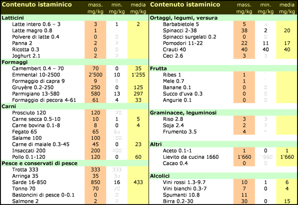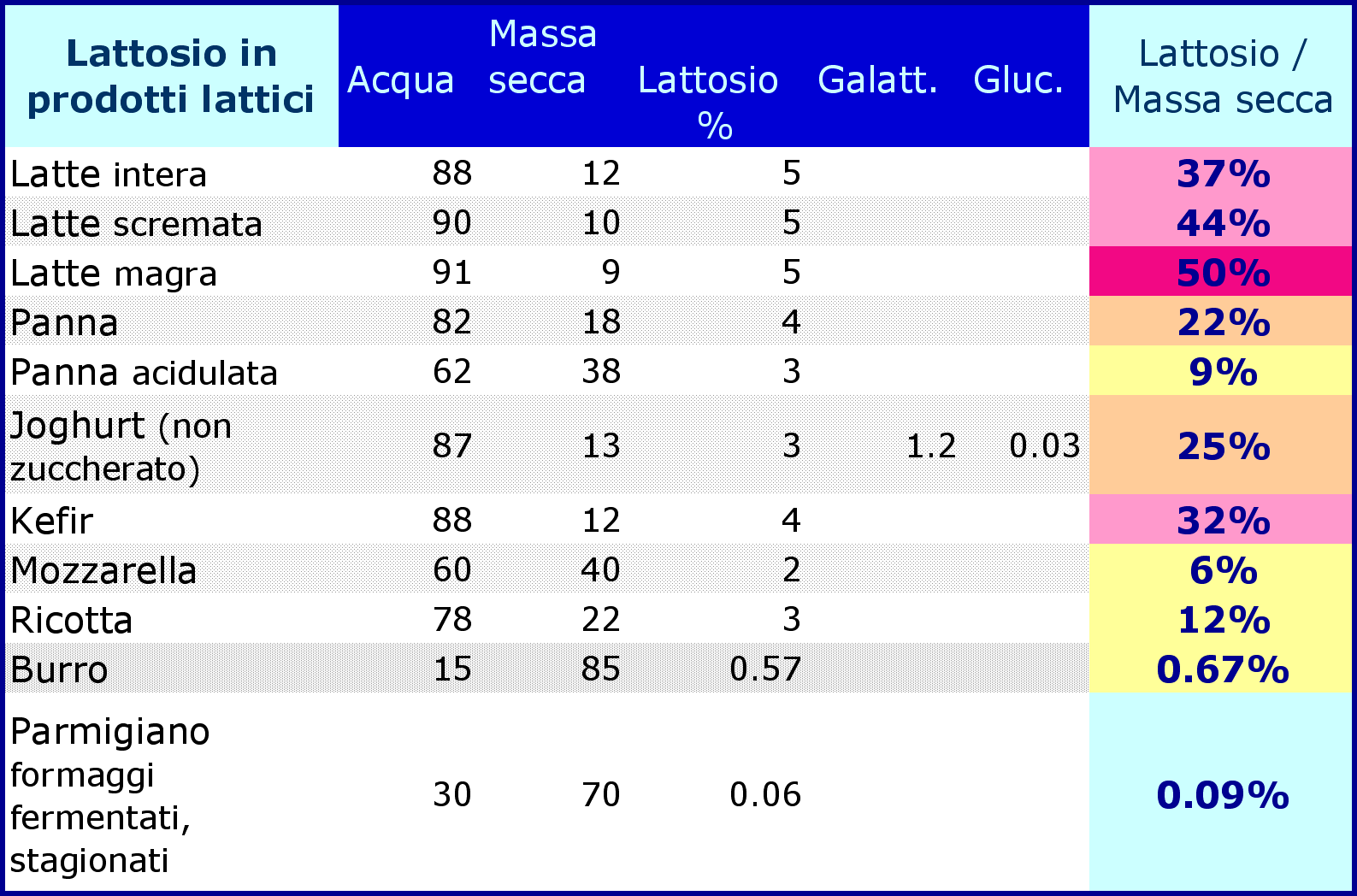 La tabella accanto fa vedere le concentrazioni di lattosio in alimenti lattici. Si nota che tutti prodotti lattici salvo dei formaggi fermentati a lungo (p.es. parmigiano) hanno dei tassi di lattosio alti, vuol dire non tollerati da lattosio-intolleranti. L'esperienza dimostra invece, che spesso anche loro sopportano bene dei formaggi ben fermentati (trasformazione di lattosio → alcol) e stagionati e il burro, se per caso piaciono.