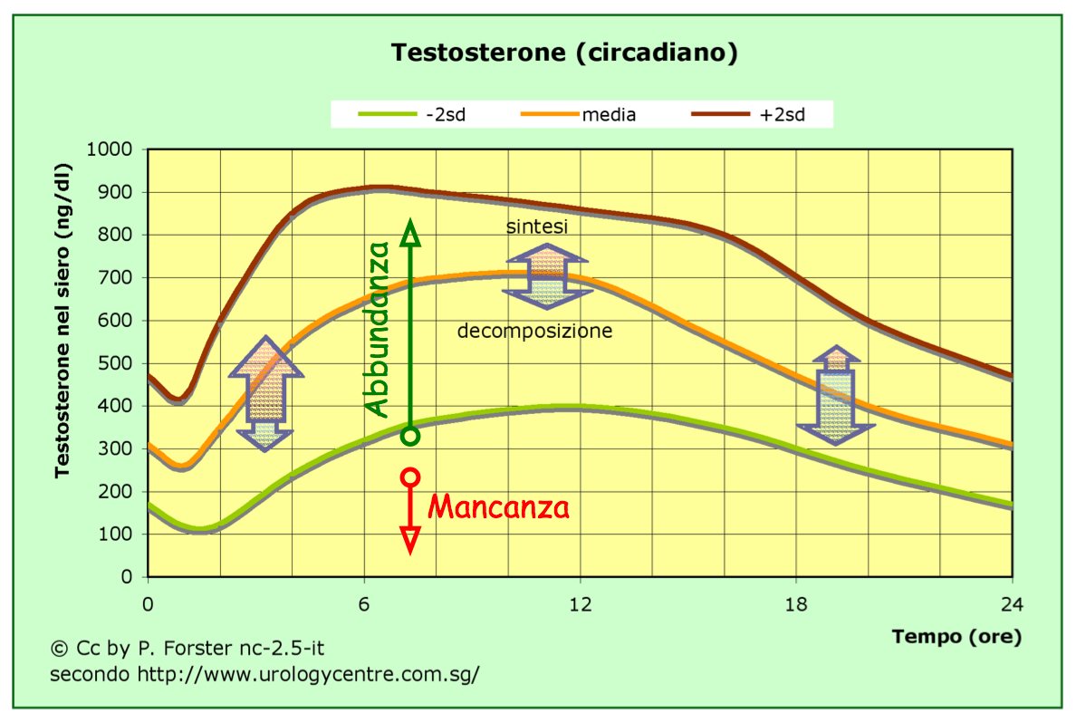 La testosteronemia raggiunge un minimo verso la 1.00 di notte. Poco dopo, la regolazione causa un notevole aumento di sintetizzazione mentre la decomposizione diminuisce, il che fa rapidamente aumentare la testosteronemia fino alle 6.00 ... 12.00. Il pomeriggio prevalgono i processi metabolici decompositori e la testosteronemia si abbassa lentamente fino alla 1.00 di notte ... .