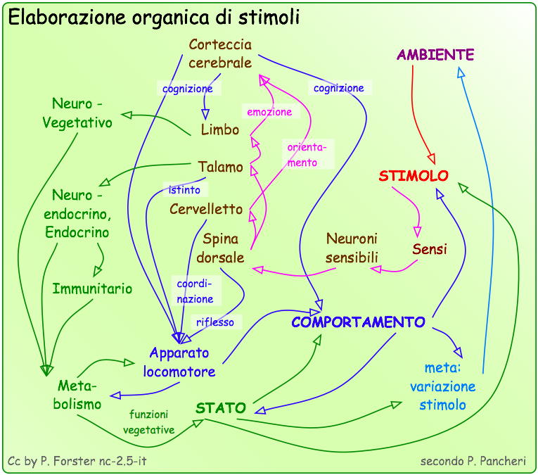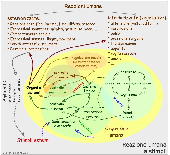 Su questa pagina ... (nascondi) Prologo: trattandosi di un tema assai complesso, consiglio di studiare attentamente i grafici ingranditi: a scopo didattico si ripetono sempre gli stessi elementi, ma ho messo in rilievo sempre un criterio diverso. 1. Percorso anatomico - fisiologicoNei mammiferi, l'elaborazione di stimoli coinvolge pressoché tutti i "sistemi" di un organismo: lo stimolo viene percepito inconsciamente dai sensi specifici e aspecifici, poi viene condotto dai neuroni sensibili periferici al sistema nervoso centrale e integrato ed elaborato in diverse tappe. Lo stimolo raggiunge quindi il sistema talamico, che mette in moto gli istinti e il sistema limbico che lo trasforma in emozione. In questa forma arriva alla corteccia cerebrale ed è finalmente percepito cognitivamente. Nelle diverse tappe sono attivati svariati sistemi di regolazione: dai riflessi neurospinali al sistema neurovegetativo, dai sistemi neuromessaggeri centrali, endocrini, ormonetessutali periferici al sistema di regolazione basale e immunitario. I sistemi di regolazione attivano e coordinano le adeguate risposte comportamentali - locomotorie, metaboliche e immunitarie - in modo da reagire allo stimolo per modificarlo con un comportamento adatto. In questi circuiti regolatori, la cognizione, situata nella corteccia cerebrale, ha la funzione di " correggere il tiro". Tutte queste funzioni avvengono automaticamente, in modo sia consapevole che inconsapevole, cambiando lo stato interno dei sistemi e creando nuovi stimoli. Ingrandisci 2. Reazioni umane agli stimoliSi osservano due tipi di reazioni umane ai stimoli: