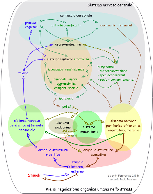 Sia le promozioni che le inibizioni possono essere soggetto di "ponderate riflessioni" tattiche,strategiche, cognitive, o semplicemente di delusione, demotivazione, stanchezza, noia come pure degli stati d'animo opposti. Si tratta di una caratteristica umana, molto meno presente negli altri animali evoluti. 4. Vie di regolazione organica umanaUn qualsiasi stimolo raggiunge l'organismo tramite gli organi e le strutture ricettive, chiamati anche sensi specifici (equilibrio, tatto, olfatto, gusto, udito, vista) e aspecifici (p.e. autopercezione). Gli stimoli sono poi trasformati in segnali nervosi e condotti tramite il sistema nervoso periferico sensoriale alla spina dorsale e poi al cervello. Già a livello della spina dorsale si hanno ?íriflessilocomotori?ì che tentano di correggere (o adattarsi) allo stimolo. La tappa successiva coinvolge talamo e cervelletto. Quest?ïultimi mettono in moto reazioni istintive e automatizzate per poi raggiungere il sistema limbico che decifra le emozioni appartenenti allo stimolo in base a diversi criteri: