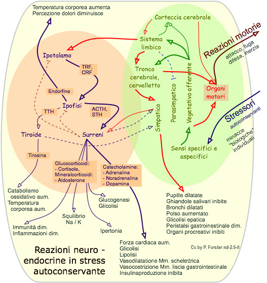 Questi programmi possono essere inibiti o promossi dalle funzioni cognitive come visto sopra. È evidente, che sorgono dei conflitti di regolazione non solo tra i tre programmi e il cognitiva, ma talvolta anche tra programmi stessi. L'esempio lampante è il bloccaggio del programma "riproduttivo" dai programmi "conservante" o "sociorelazionale" attivato. Inoltre i valori della nostra cultura non distinguono molto bene i tre criteri, p.e.: sotto il termine abiologico dell'amore si subsommano un pò di elementi conservanti (p.e. generosità), sociorelazionali (p.e. matrimonio) e riproduttivi (p.e. sessualità). È evidente, che un tale miscuglio a livello cognitivo non migliora la regolazione biologica. 6. Reazioni neuro - endocrine e motorie allo stressIl grafico accanto tenta di raggruppare i nessi tra i sistemi " nervoso, endocrino (ormonale) e locomotorio per il programmma dell'autoconservazione. Il grafico risulta frammentario, e ciò per motivi didattici, ho infatti tralasciato il sistema motorio della muscolatura liscia, il sistema neuromessaggero centrale e degli ormoni tessutali nonché il sistema immunitario. Inoltre si noti che la regolazione socio-relazionale e specie-conservante funzionano (nel dettaglio) diversamente. I processi regolativi dell' autoconservazione si svolgono nel seguente modo: