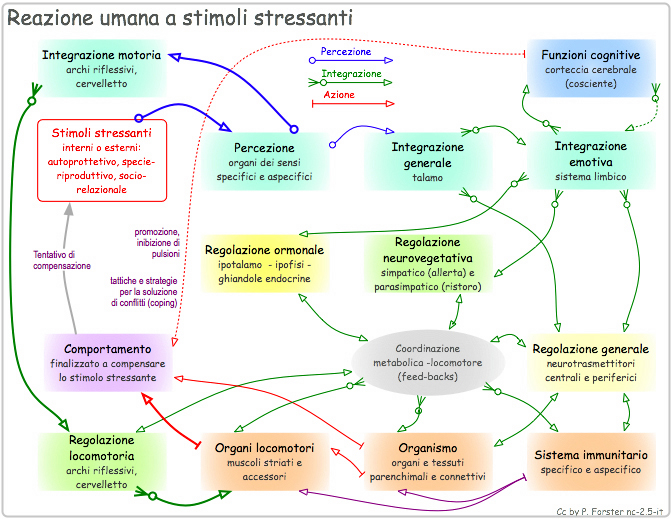 Questo processo rappresenta una parte del motore della cultura umana. Dall'altra parte può interferire nelle nostre funzioni biologiche: ogni mossa determinata da regole civilizzate esplicite o tacite (leggi, norme, convenzioni, costumi, morale, etica canonica e laica) è per definizione un confronto con istinti ed emozioni biologiche. In pratica, si tratta di trovare una via che non ci trasformi in una sorta di "inquisitori" civilizzati (il che sarebbe biologicamente malsano) né ci riduca allo stato di "bestie" (il che è socialmente punito). 5. Programmi biologici per la regolazione di stressStressori, dopo una reazione iniziale rilessiva, istintiva ed emotiva attuano, secondo il caso, un determinato programma per il controllo e la regolazione di una sensata risposta: