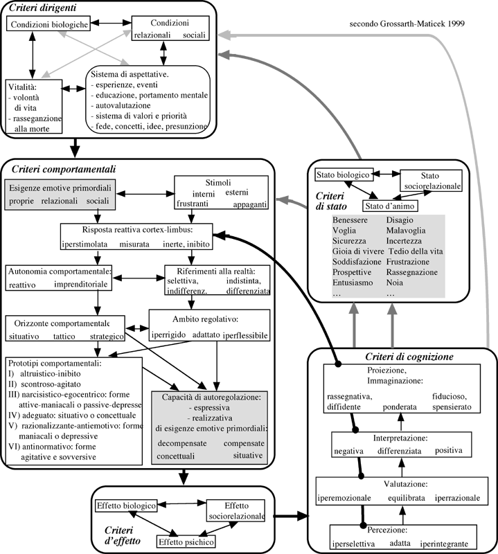 I modelli comportamentali rispecchiano condizioni e interferenze tra fattori biologici, sociali e psichici, focalizzandosi su circuiti regolativi comportamentali. Nel seguente modello ho sviluppato delle idee di Grossarth-Maticek [2]. Grossarth-Maticek lavora parecchio con comportamenti e reazioni tipiche, il che facilita il lavoro terapeutico da una parte, anche se dall'altra non è molto differenziato. Ma almeno ricorda lo spettro di tipiche reazioni umane.