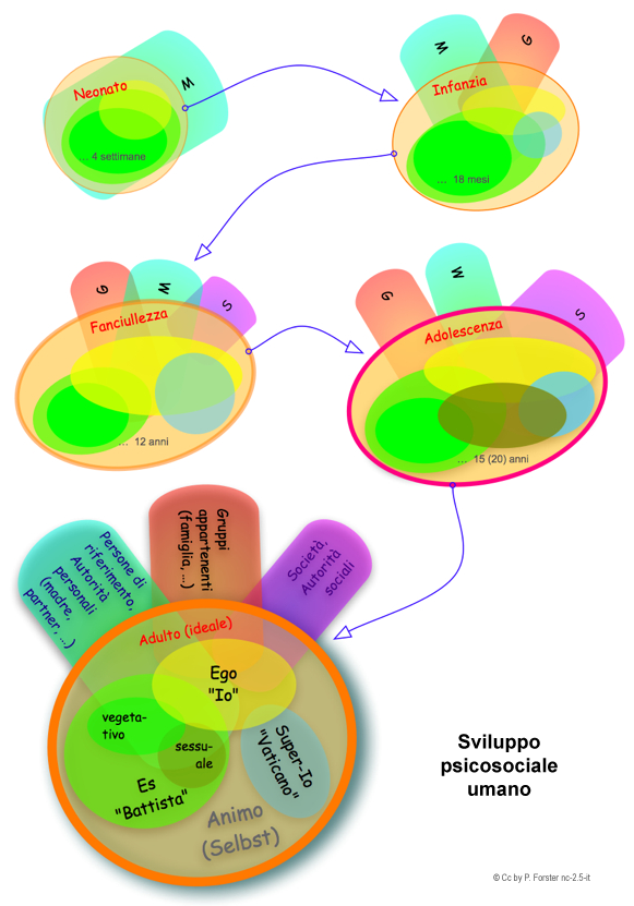 I modelli relazionali illustrano le relazioni con sè stessi (diverse istanze del "Sè"), con un'altra persona emotivamente importante e nel seno di gruppi funzionali (famiglia, lavoro, ...) e formali (autorità). Ne ho scelto uno che uso nelle conferenze sulla pediatria e che spiega lo sviluppo somato-psico-sociale umano