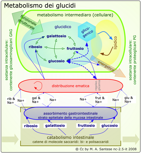 Assimilabili dall'intestino sono i quattro monosaccaridi ''ribosio, galattosio, fruttosio e glucosio. Per il trasporto tramite le cellule mucotiche intestinali nel sangue hanno bisogno di un ione di Na+, il quale viene restituito a trasferta conclusa. Il glucosio (non gli altri tre monoscaccaridi) aumenta la glicemia (glucosio nel sangue) il che fa avviare i meccanismi regolativi (insulina → saracinesche cellulari per → l'assorbimento cellulare del glucosio → abbassamento della glicemia) o pure all'inverso (glucagone → chisura saracinesche cellulari → avviamento fegato per produrre glucosio a partire dal glicogeno → aumento della glicemia).