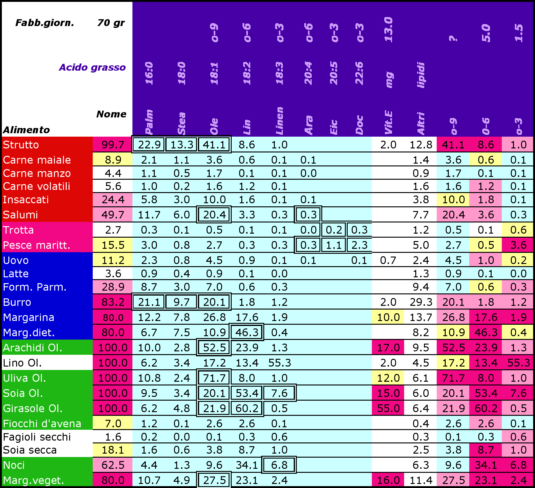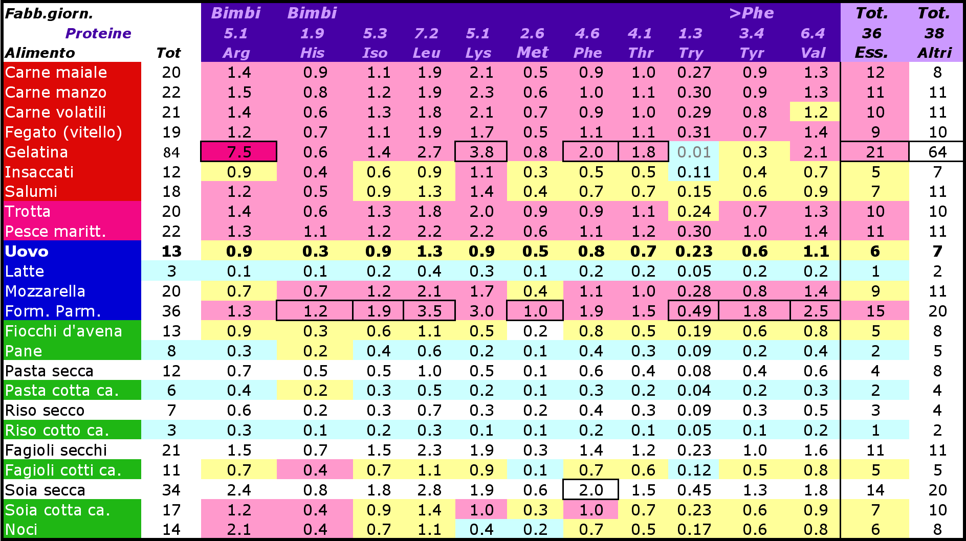 | S (Zolfo) | ? | gr | proteine animali, oli e grassi. |