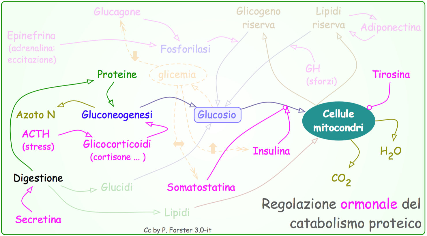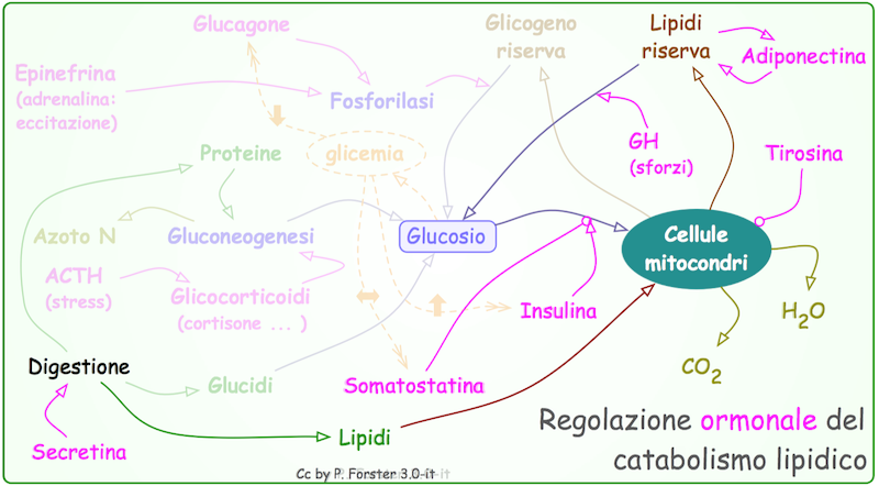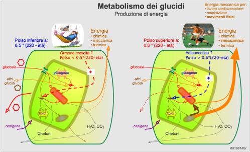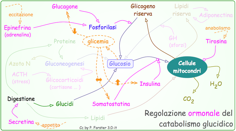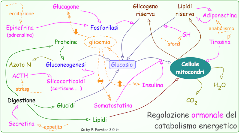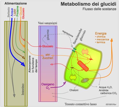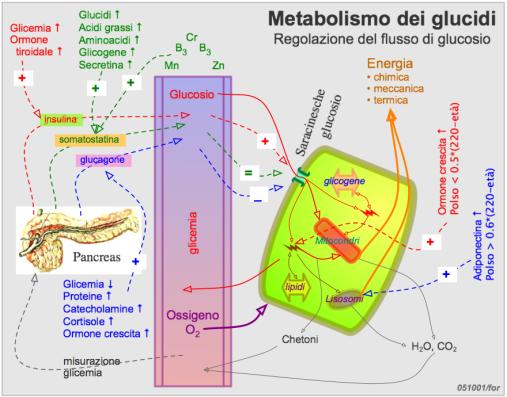 La regolazione (informatica) del flusso di glucosio e di altri zuccheri e acidi grassi, nella discontinuità tra approvvigionamento alimentare e spesa energetica, è molto complessa.