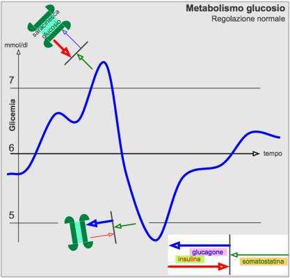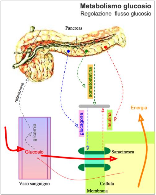 A dipendenza del tasso glicemico il pancreas produce i tre ormoni menzionati sopra e li manda in circolazione. Raggiunte le saracinesche queste vengono aperte (insulina) o chiuse (glucagone), di più o di meno secondo il livello della somatostatina.