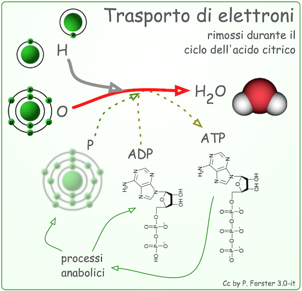 Elettroni ad alta energia rimossi durante il ciclo dell'acido citrico entrano in una catena di molecole che vengono incluse nella membrana interna dei mitocondri; quando gli elettroni si muovono discendendo la catena, rilasciano piccole scariche di energia per pompare protoni nello spazio tra le membrane interna ed esterna dei mitocondri.