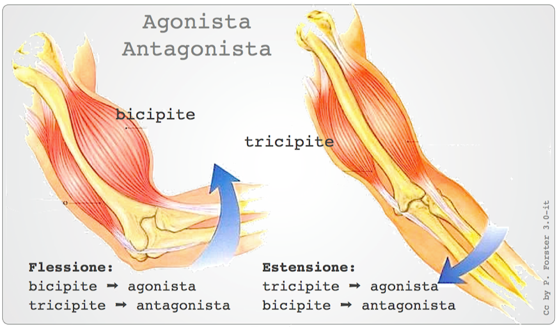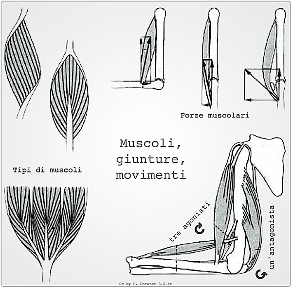 I movimenti "esterni" dell'organismo e articolazione avvengono tramite la contrazione ed il rilascio dei muscoli striati, che fanno leva tra due ossa divise da una giuntura elastica o articolare. Visto che un muscolo fisiologicamente può solo "tirare" (non spingere), i movimenti sono sempre organizzati tra due muscoli: agonista (tira) e antagonista (rilascia).