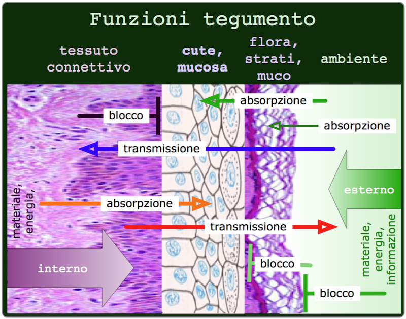 :con lo smaltimento delle relative scorie. Sono aperti verso l'esterno e delimitati da una mucosa e da pelle verso l'interno dell'organismo. Servono soprattutto allo scambio informatico, materiale ed energetico dell'organismo. In certi testi (non in questo) il sistema tegumentario (pelle, cute) è classificato con l'apparato motorio.