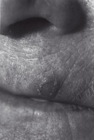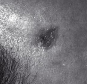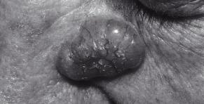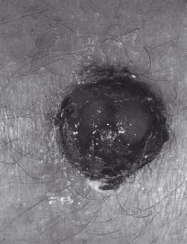 Noduli molli scuri circondati da una zona di pelle infiammata (arrossata). Metastasi.