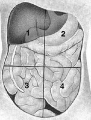 Divisione mediana/sagittale ombelicale per descrivere la zona, p.es. dolori ottusi in quadrante I.