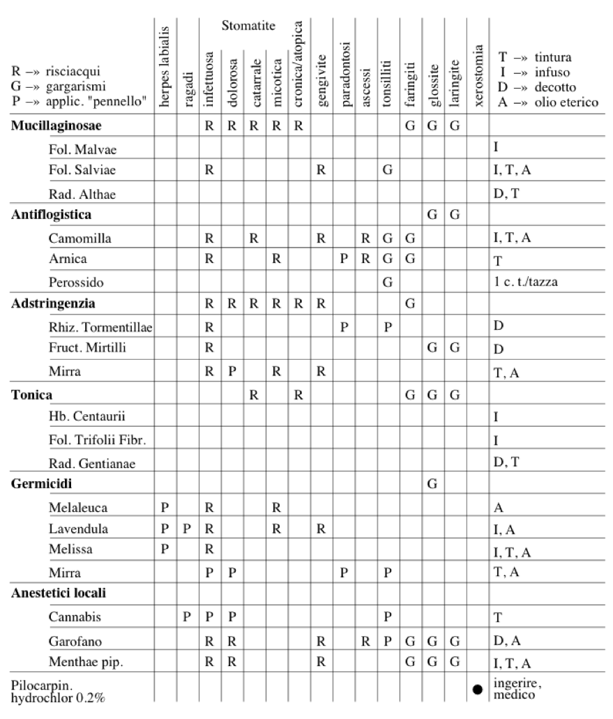 Stomatiti. Gengivite, paradontosi (paradontopatie). Ascessi boccali. Mal di denti. Farmacologia fitoterapeutica cavità boccale. Ricettario cavità boccale.
