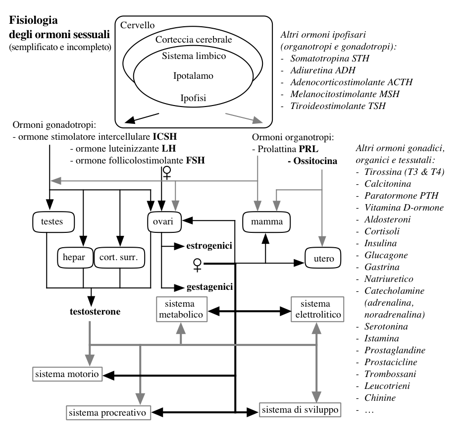 Cerco di ricapitolare brevemente i meccanismi regolatori ormonali più importanti del sistema procreativo. Visto che si tratta di una materia molto complessa, e solo in parte nota, anche la rappresentazione è di conseguenza semplificata e incompleta.