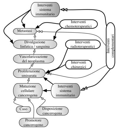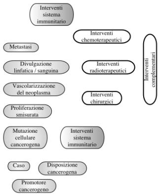 Il seguente schizzo fa vedere alcuni tappe di uno sviluppo neoplastico e interventi del sistema immunitario e mediche. Serve la dispensa PT 1.2: Elementi di oncologia.